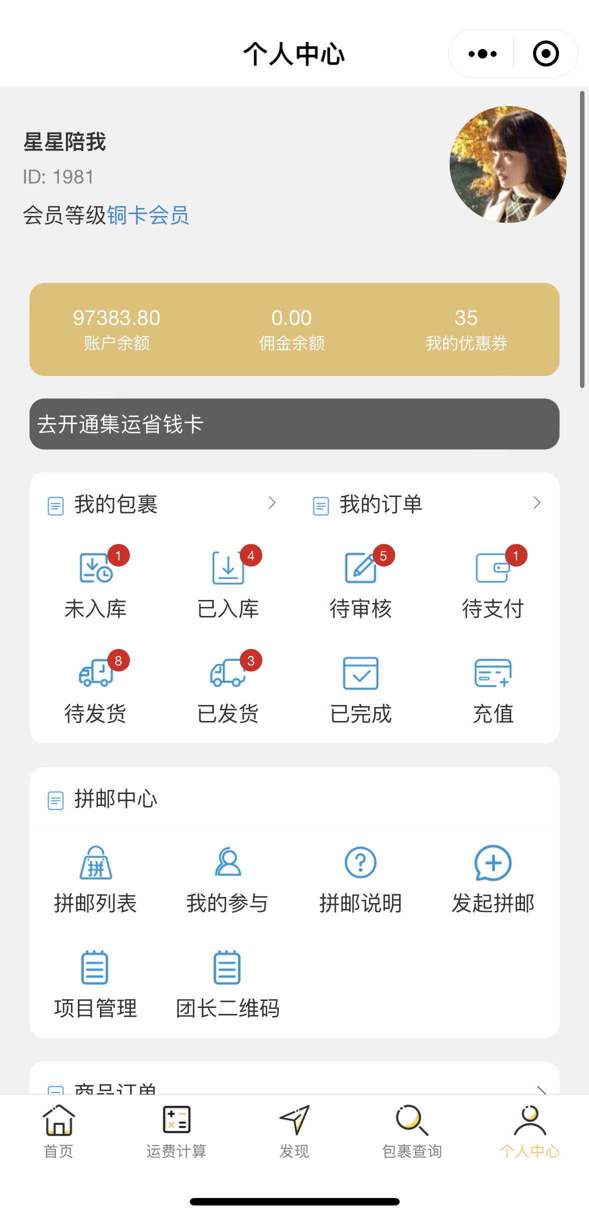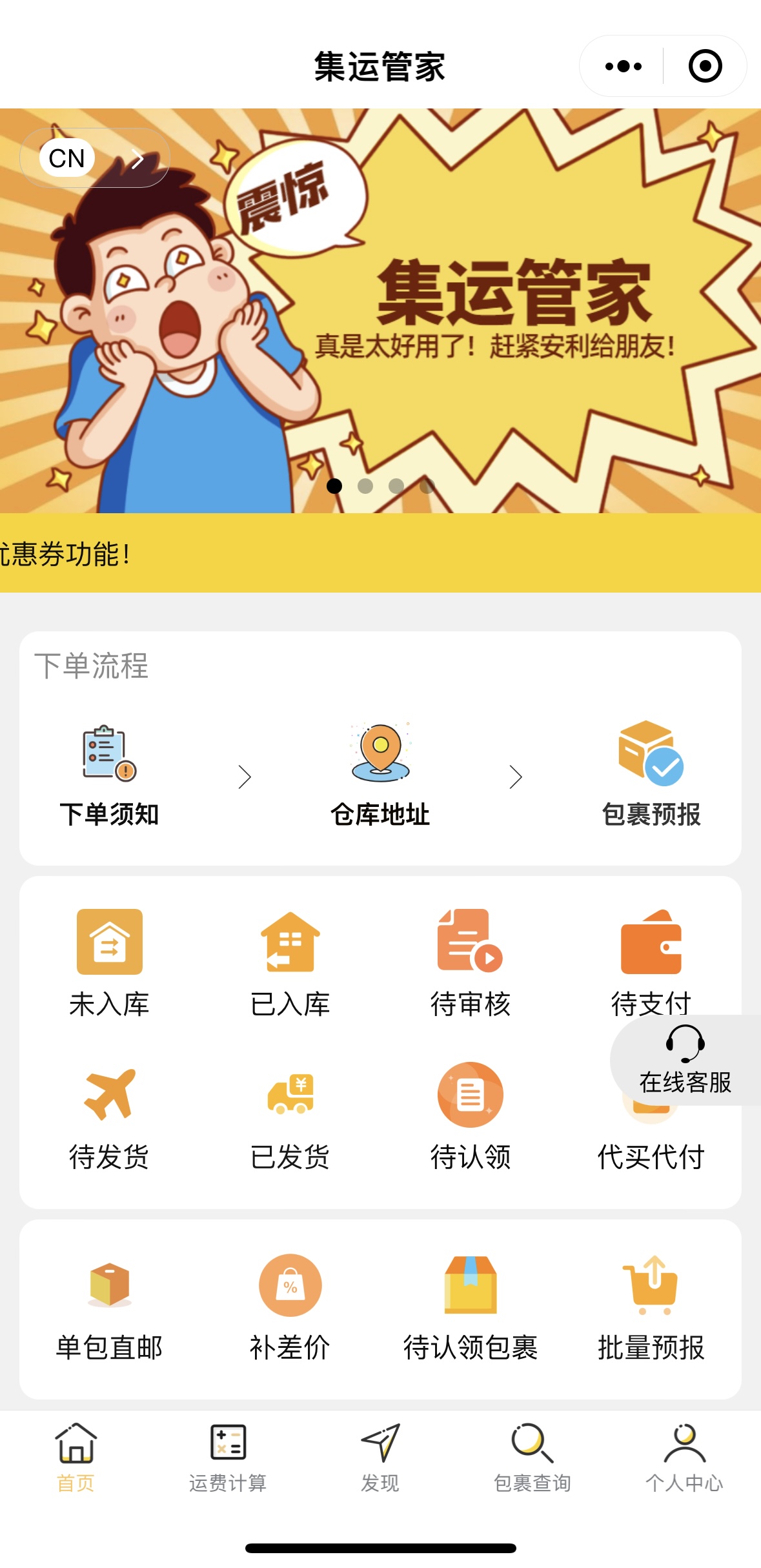 嗨轉寶集運小程序清晰明了的訂單管理系統(tǒng):待打包、待支付、待發(fā)貨、貨到付款、已發(fā)貨一目了然